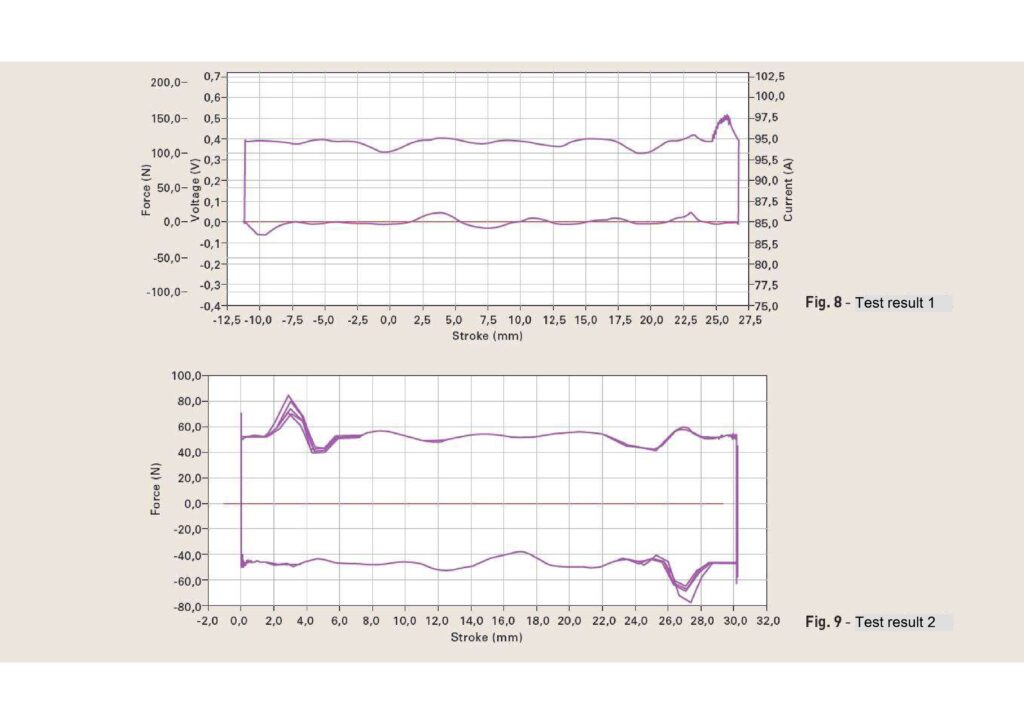 The integrated force feedback control system represents a significant technical achievement. Because aeronautical actuators often feature irreversible locking mechanisms and closed electronic control architectures, the linear motor must operate exclusively in force-control mode. A dedicated control algorithm ensures that during motion reversals typically the most critical phase overload conditions are avoided, preventing actuator shutdown or mechanical damage.